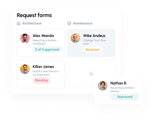 Ditch the paper forms of the past and get rid of your filing cabinets. Taking your request forms online is easy with our HOA software featuring our custom form builder. Customize your questions and response types, add custom statuses, and create approval workflows.